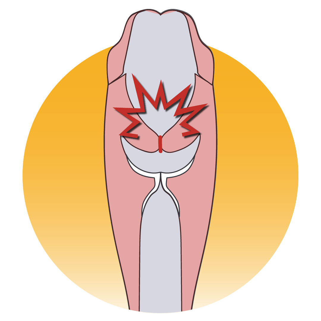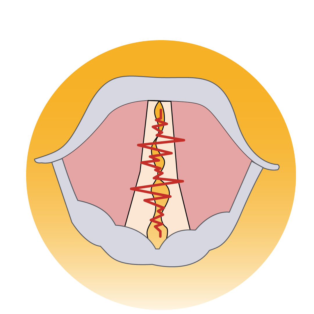 Le Grunt est produit lorsqu’un excès de débit d’air provoque une vibration complexe des cordes vocales.